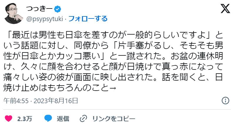 【マジ注意】「日傘差すと片手塞がるし、何より男が日傘とかカッコ悪い。無対策でいいやろ」→観光から帰宅後、ヤバいことになる・・・